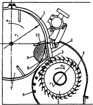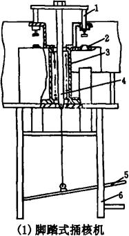 图1-6-18 切条机工作原理图 1-片厚调节机构 2-导向压板 3-物料片 4-切条刀 5-切条刀回转滚 6-物料条 7-切片回转腔 8-切片刀 9-物料 10-推料叶片 切条机工作时,物料以一定的数量送入喂料斗后进入高速旋转的切片回转腔7,由于离心力的作用,物料紧靠回转壁,在推料叶片10和切片刀8的共同作用下完成切片过程。切出的料片又以一定速度在导向压板2的辅助作用下,向高速旋转的切条刀4喂入完成切条工序。通过调整片厚调节机构、切条刀数和切条刀回转速度可以改变料条截面尺寸。 3.4 山楂捅核机(图1-6-19) 图1-6-19所示为目前广泛使用的两种山楂捅核机。 图1-6-19(1)所示为脚踏式捅核机。该机有2把上刀1和2把下刀2。工作时脚踩踏板5,通过拉杆4带动上刀1切入山楂,并直接将果核经下刀2的内孔捅出。 图1-6-19(2)所示为多刀捅核机。它由16把上刀1和16把下刀2、果模,以及链传动、齿轮传动和凸轮传动等机构组成。果模有分离式和组合式两种,前者靠人工周转,后者由链传动自动周转。工作时要靠人工把山楂放入果模中。当果模进到工作位置后,捅核机的上、下刀几乎同时切入果肉中,下刀在山楂花萼处切入一定深度后,即自行下落,上刀则继续下行,直至把果核捅出。