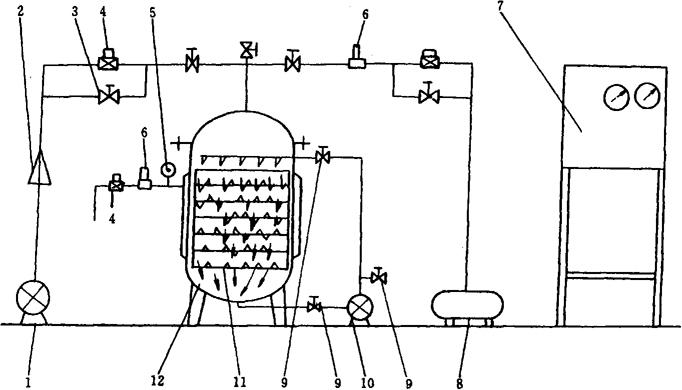 图1-6-20 青枣划丝机工作原理图 1-进料斗 2-划丝头 3-中间齿轮 4-传动电机 青枣切丝机工作时,物料由进料斗1落入定向装置中,送料推杆通过传动机构将物料推进划丝头中,划丝头按工艺要求按圆周方向均布24个划丝刀片,刀片通过弹簧装置固定在划丝圆筒上,这样可保证按物料的实际情况进行仿形,始终保证划丝的深度均匀一致。该机是蜜枣加工中的重要设备之一。 3.6 真空加压浸糖设备(图1-6-21)