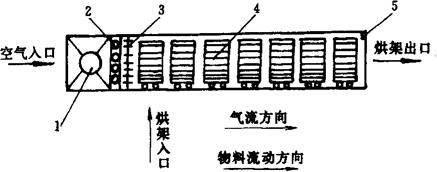 图1-6-23 烘房示意图 1-热风道 2-小车及托盘 3-循环风机 4-排潮风机 5-散热器 6-墙体 |