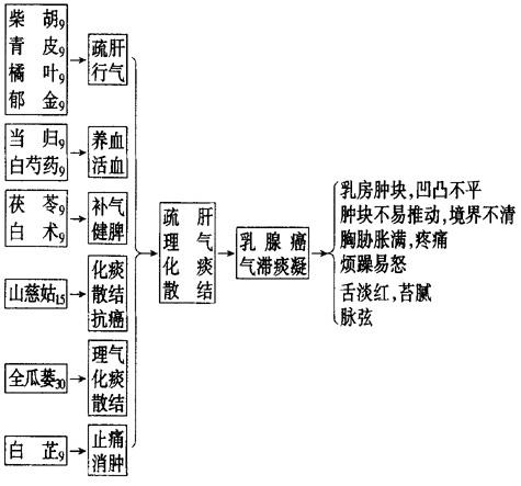 【要点】 本方由逍遥散加减而成。在舒肝健脾的基础上加入青皮、桔叶、瓜蒌、白芷、郁金等行气散结,均为乳腺病常用药。方中山慈姑有抗癌作用。 【应用】 乳腺癌、乳腺小叶增生症。 【注意】 山慈姑有良好的抗癌化痰散结功效,但毒性较大,应注意用量。 【类方】 1.郁金逍遥散(《中级医刊》):由柴胡、当归、白芍药、白术、茯苓、橘皮、郁金、夏枯草组成。功效疏肝理气,健脾和胃。主治乳腺癌属肝郁气滞者。 2.乳一方(乳核内消片,《古今名方》):由柴胡、当归、郁金、橘核、山慈姑、香附、漏芦、夏枯草、茜草、赤芍药、青皮、丝瓜络、生甘草组成。功效疏肝活血,软坚散结。主治乳腺小叶增生。 |