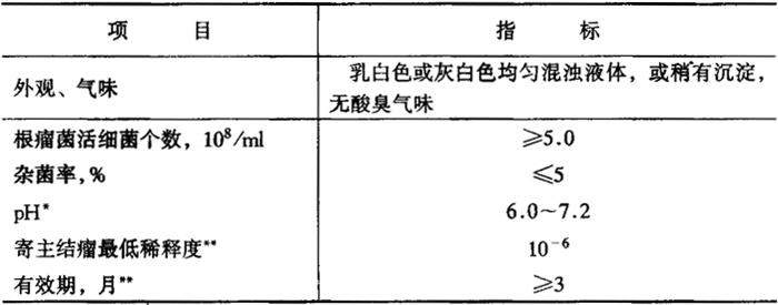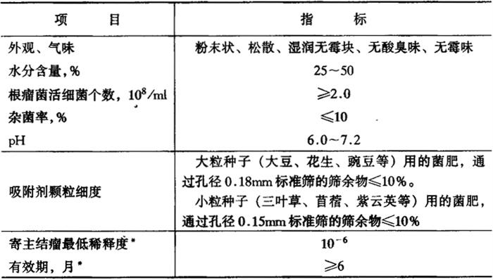 * 用耐酸菌株生产的菌液,pH可以大于7.2。 * * 此项仅在监督部门或仲裁部门检验双方认为有必要时才检测。 (2)固体根瘤菌肥料。肥料形态呈固体的根瘤菌肥料,技术指标见表2-33。 表2-33 液体根瘤菌肥料技术指标