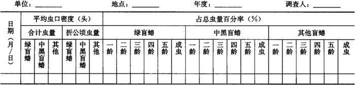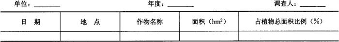 2.2.5 二代虫量调查 选择当地主要寄主(如大豆、蔬菜留种田、苕子、紫花苜蓿、马铃薯、胡萝卜、聚合草、马唐等)2~3种。每种寄主查1~2块,从6月上旬开始,5天1次,连续查5~6次。采用2.2.2.2的扑打法,统计每公顷虫数,各龄虫百分率。调查记载表同表5-43。 2.2.6 二代虫量及寄主作物普查 在各优势种盲蝽二、三龄若虫高峰期,分别对大田进行普查。普查采用2.2.2.2的扑打法。记载表样式同表5-43。 2.2.7 观察区主要作物面积比例调查 选择当地一个自然村,调查各种主要寄主植物面积及其所占比例。结果记入表5-45。 表5-45 观察区各种主要寄主植物面积调查表