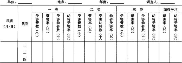2.2.8 二至四代棉田虫量调查 选择当地各代所占面积最大棉田类型和易受害的棉田各1块,从6月10日开始,至9月底结束。采用5点取样法,二、三代每点查10株,共计50株;四代每点查5株,合计25株。5天调查1次。检查棉株嫩头、花蕾、幼铃上的成、若虫数。统计百株虫数及各龄虫所占百分比。记载表样式同表5-43。 2.2.9 二至四代棉田虫量普查 在各代主要优势种盲蝽二、三龄若虫高峰期,及大面积防治结束后,分别对大田进行普查,以验证预报的准确率和检查大面积防治效果。每次普查的田块数不少于10块,普查取样方法同系统调查。记载表样式同表5-43。 2.3 受害情况普查 2.3.1 嫩头受害普查 在二代二、三龄若虫高峰期,普查棉株嫩头受害情况。在一、二、三类田各查3块,分别记载新、老受害株,统计新、老受害株百分率,并记载当地一个自然村的各类型田的面积,将其加权平均。结果记入表5-46。 表5-46 嫩头受害情况普查表
