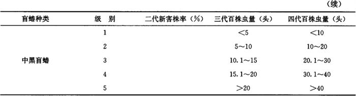 4.2 发生量和发生程度预测 根据残留虫量和寄主作物面积、结合气象预报情况,参照历史资料,应用多种预测方法,做出发生程度预测。 5 发生程度分级标准 江苏省的绿盲蝽和中黑盲蝽发生程度和分级标准