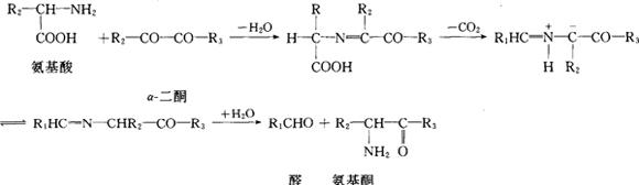 5.Strecker降解反应 在上述反应中生成的α-二羰基化合物与氨基酸作用产生一个很活泼的氨基酮和比氨基酸少一个碳原子的醛,释放出二氧化碳,用同位素示踪的试验中证实释放出的二氧化碳主要来源于氨基酸中的羰基。氨基酸降解所产生的醛是棕色化产物中醛的主要来源。由于氨基酮的性质很活泼,在形成各种杂环化合物的反应中占有很重要的地位。