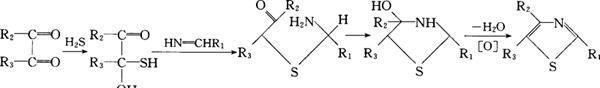 (10)噻唑类化合物。α-二酮与硫化氢和亚胺类作用生成噻唑类化合物。