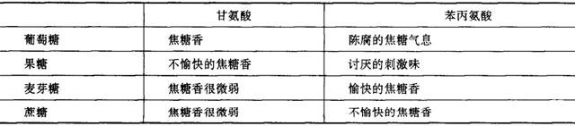 表5-6-15 两种氨基酸和四种糖类在pH为6.5和100℃时反应产生的香味
