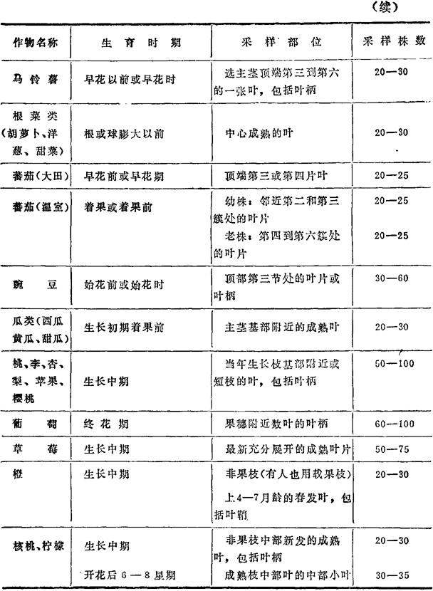 | 释义 | 植株样品的采集、制备和保存 植株样品是指植株茎、叶等组织样品,此类样品往往用于诊断植株养分残缺,研究植株体内养分转移流动方向,物质成分数量变化以及探讨作物阶段营养规律等等。采样时用于前几项目的常采集与分析元素密切关联的具有指示性意义的部位及器官进行分析,用于阶段营养规律研究的常进行全植株的采样分析。 一、样品的采集 在田间采样时,可象采集土样一样,按照一定路线进行,并在使生产不受损失或少受损失的条件下,尽量多采集样品,此外还应遵循下列原则: (1)受病虫害或机械损伤的植株不宜采样。 (2)当植物受高温,或干旱灾害影响时不宜采样。 (3)遮荫植株及有机肥料堆置处的植株不宜采样。 (4)植物组织上面有较大尘埃及泥土时不宜采样。 (5)茎叶部分特定部位的采样,一般应在植物生殖生长阶段初期或稍前期为宜。尤其是谷类作物,一般在授粉后不宜采样,因此时茎叶部分的养料浓度极不稳定,变化极大。生理上过分幼嫩的组织,由于养分组成变化迅速,也不宜作为特定部位的采样。 (6)一般不应用种子作其营养状态的鉴定。但却可用其发芽的幼苗来检定一些元素的残缺。 (7)生长不良的田块,植株取样数应比正常的多采些。 (8)样株采回后需要分不同器官测定(如分叶片、叶鞘或叶柄、茎、果……等)时,应在采样后立即将其剪开,以免养分转移。 (9)采样方法见表25-1,供参考。 表25-1 大田作物、蔬菜作物及果树的采样方法