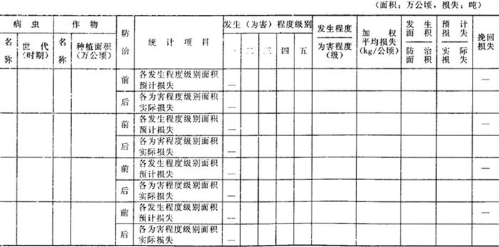 注:(1)该表数据根据当地大田抽样调查结果汇总统计,为全县的代表数 (2)各级别发生(为害)面积亩数依据抽样调查时该级别占种植面积百分比例数折算 (3)防治前的预计损失系指该发生级别在不防治情况下的自然损失,防治后的实际损失系指经过防治后(包括应治而未治的田块)仍然造成的产量损失。损失估计,全国或各省、市、自治区已经制定有统一标准的按统一标准折算,否则可按当地经验值进行估算;挽回损失=预计损失-实际损失 |