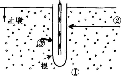 图1-1 养分离子向根部迁移一般通过3种途径 ①截获 ②集流 ③扩散 (1)截获:根系从土壤中吸收养分时,由于植物根与土粒密切接触,因此,根细胞外H+和黏土外交换性阳离子发生离子交换。这种由于接触土壤而获得养分的过程叫截获。通过截获吸收离子态养分极少,但钙离子经截获移至根部一般较多些,其次是镁离子。 (2)集流:由于植物的蒸腾作用,使养分随水流通过土壤孔隙向作物根部的迁移即集流。它主要受植物的蒸腾作用和土壤溶液中离子态养分多少的影响。当土壤温度高时,植物蒸腾作用较大,体内失水较多,使根际周围水分不断地流入根表,土中离子态养分也就随着水流达到根表。当土壤中离子态养分含量较多,供给根表的养分也随着增加。氮、钙、镁主要是由集流供给的,而且钙、镁供应量常能满足一般作物的需要。 (3)扩散:在土壤溶液中当某种养分浓度出现差异时,所引起的养分迁移到根表的过程。这一作用使养分从浓度高处向浓度低处移动,直至达到平衡。当根对养分的吸收大于养分由集流迁移到根表的速率时,根表面养分离子浓度下降,同时根周围土壤中养分也有不同程度的减少,出现根际某些养分亏缺,于是根表与附近土体间产生浓度梯度,高浓度养分向低浓度处扩散,土壤中养分则向根表迁移。植物养分在土壤中的扩散受很多因素影响,如Cl-、K+、NO3-在水中扩散系数较大,而PO43-则较小,土壤质地较轻的砂土,养分扩散速率比质地较重的土壤快,土温高的比土温低的扩散快等等。 应该说以上养分迁移的3种过程在土壤中是同时存在的。但总体来说,截获取决于根表与土壤黏粒接触面积的大小,集流取决于根表与其周围水势的大小,扩散取决于根表与其周围养分浓度梯度的高低,它们都与根系活力有密切关系。 2.植物对养分的吸收机制 土壤溶液中养分离子通过集流与扩散以及部分根部截获到达根表面,吸附在细胞表面。这些离子先进入自由空间,即从细胞壁到原生质膜的空隙,还包括细胞间隙,然后进入根系的内皮层。 (1)被动吸收:是顺着电化学势的梯度运输,即离子在细胞的自由空间内,可以通过扩散或质流经细胞膜向膜内移动;同时是不需要代谢供应能量的吸收作用。包括以下两种: A.简单扩散:当细胞外溶液的浓度大于细胞内时,溶质分子就会由于扩散作用进入细胞内。 B.杜南平衡:植物在吸收营养物质时,常有这样的情况,细胞内某种离子的浓度已经超过了外界该离子的浓度,该离子仍可逆浓度梯度扩散而进入细胞内,达到平衡。这种现象只有用杜南(F.G.Donnan)提出的平衡理论才能说明。 杜南指出,细胞内有不能扩散出的阴离子(R-)(如蛋白质离子)存在,它在细胞内必然会吸引一些阳离子如Na+,而以盐的形式存在于细胞内,使细胞呈电中性。将这个细胞放入NaCl溶液中,因为细胞内没有Cl-,细胞外的Cl-势必向细胞内扩散,由于电荷不平衡,Na+也跟随而进入,当细胞内可扩散正、负离子浓度的乘积和细胞外可扩散的正、负离子浓度的乘积相等时,达到平衡状态。这种平衡称为杜南平衡,其表达式为: