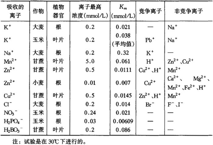 当 当酶促反应速度等于最大速度的一半时,此时的底物浓度就是Km。由于 它与k1成反比。因此,Km值愈小,表示酶对底物的亲和力愈大,酶促反应速度则愈快。所以,Km值是酶对底物亲和力的倒数。 依据上述原理,对各种作物根或叶片在不同浓度溶液中吸收各种离子的速度进行研究,可求出Km值(表1-2)。例如观察甘蔗离体叶片在30℃时吸收Zn2+和Cu2+的速度,测定其Km值分别为0.0111mmol/L和0.0145mmol/L,表明甘蔗叶片对Zn2+和Cu2+的亲和力基本相当;而将大麦离子根放在不同浓度氯化钾溶液中,观察30℃吸收K+的速度,测定其Km值为0.021mmol/L,Na+则为0.32mmol/L,表明大麦根对K+的亲和力远大于Na+。所以当溶液中K+和Na+同时存在时,则可选择吸收K+。这与各种酶对于不同底物具有不同的Km值很相似。 表1-2 各种作物对各种离子在低浓度下的米氏常数(Km)