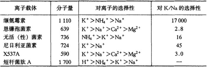 图1-2 A.离子通过膜的传递模式 B.配合能量消耗 (Marschner,H.,1986) 主动吸收过程有载体存在,可以从下列两方面得到证明: 第一,饱和效应。在研究离子吸收与外界离子浓度的关系时发现,细胞对离子的吸收有个最大的极限值。在外界离子浓度比较低的范围内吸收速率与离子浓度成正比,当离子浓度超过某个数值以后,随着外界离子浓度的增加,吸收速度的增加会变得缓慢,最后细胞对离子的吸收达到饱和后,就不再吸收。这种现象称为饱和效应,即一种特定的离子有一种特定的载体,当载体上的结合部位被饱和后,尽管外界溶液中离子浓度增加,主动吸收的速率也不再增加。 第二,离子竞争。研究不同的离子在吸收过程中的相互关系时发现,离子吸收表现竞争性的抑制。例如,将大麦根浸在含Cl-的溶液中,再加入Br或I-后,Cl-的吸收就减少,这说明Cl-和Br-或I-可以和同一载体相结合,表现出离子竞争现象。而磷酸或硝酸与氯结合的载体不同,则无竞争抑制作用。 近年来,从酵母和其他微生物的质膜中,已分离出能运载某种分子或离子的透过酶,这就是载体,可是在高等植物中尚未发现。但有人用抗生物质作为离子载体进行试验,发现燕麦培养液中加入短杆菌肽后,燕麦可选择吸收K+,当加入氰酸盐被抑制后,吸收也受到抑制。目前研究离子载体的抗生物质有以下几种,见表1-3。 表1-3 离子载体(抗生物质)的特性