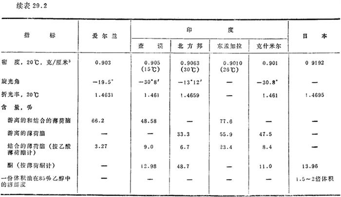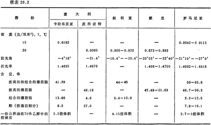 表29.8 根据英国标准(BS2999/39∶1971)各国精馏椒样薄荷油的质量指标