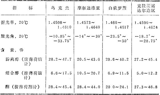 表29.6 苏联各地区生产的精馏椒样薄荷油的物理化学指标