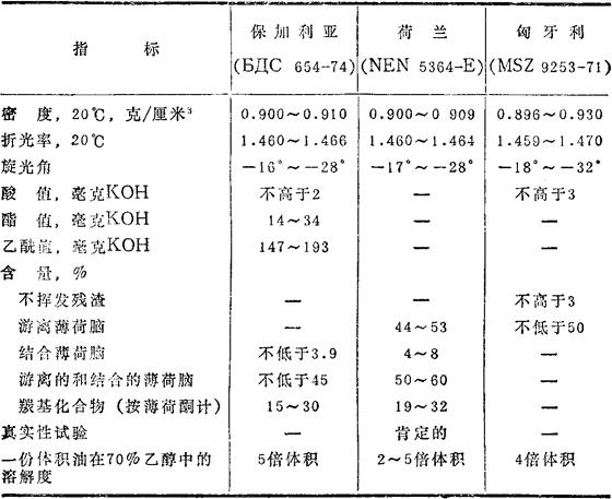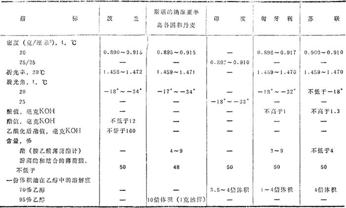 根据国际标准化组织技术委员会的推荐(NCO TK-54R 856-68),椒样薄荷油的质量应符合表29.10中的要求。 表29.10 根据国际标准化组织技术委员会(ИСО TK-54)的推荐,各国椒样薄荷油的质量指标