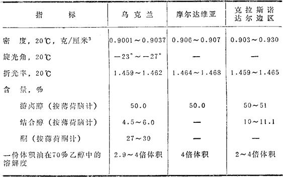 在苏联,薄荷的主要种植和加工地区是乌克兰、摩尔达维亚、克拉斯诺达尔边区和白俄罗斯。 在这些地区的工厂里所制得的粗制薄荷油的性质见表29.3。 表29.3 苏联各地区产粗制薄荷油的物理化学指标