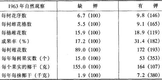 钾对所有产量因子都起作用,能使花序数、雌花数、椰果数、果实椰干平均重量和总重量增加(表6-33)。在严重缺钾地区,钾的效应特别显着。 表6-33 钾对产量因子的效果(象牙海岸9年生结果树) (热带作物栽培学“椰子”,1980)