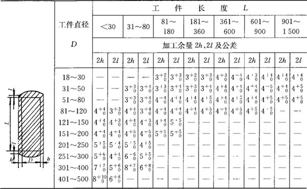注:1.表列加工余量及公差均不包括锻件的凸面及圆弧。 2.应按H或B的最大截面尺寸选择余量,例如:H=50mm,B=120mm,L=160mm的工件,其H的最小加工余量应按120mm取5mm,而不是按50mm取4mm。 ②圆形锻件加工余量见表7.1-5。 表7.1-5 圆形锻件的加工余量 (mm)