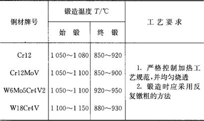 ②高铬合金工具钢和高速工具钢的锻造工艺要求见表7.1-7。 表7.1-7 高铬合金工具钢和高速工具钢的锻造工艺要求