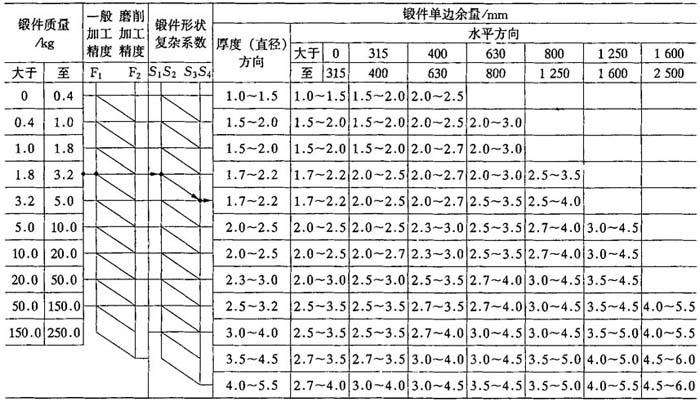 | 释义 | 模锻件图的制定 7.2.1.1 分模线(面)的选择 分模面分为以下两类: (1)平面分模面和对称弯曲分模面. (2)不对称的弯曲分模面. 选择分模面应考虑下列主要条件:能自由地从模膛中取出锻件;最佳的金属充满模膛条件(镦粗比挤入更容易将金属充满模膛);力求减少余块和飞边损耗;简化模锻工艺和模膛制造工艺(如圆形短轴类锻件尽量选用圆形的分模面)等. 7.2.1.2 机械加工余量和尺寸公差确定 机械加工余量和尺寸公差确定见表7-13~表7-18. 表7-13锻件内孔直径的单边机械加工余量(JB3834—85)