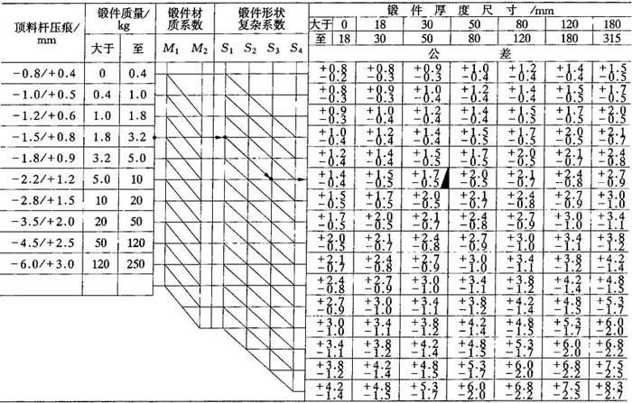 例:当锻件质量为3kg、材质系数为M1、锻件复杂系数为S3、锻件最大厚度尺寸为45mm、油炉加热时各类公差查法. 表7-18 模锻件的厚度公差及顶杆压痕公差(精密级)(JB3834—85)