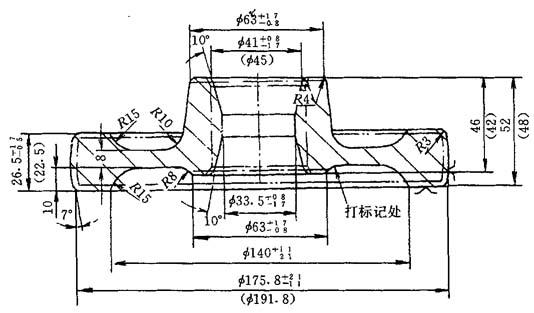 图7-1 冲孔连皮 (2)锻件图中锻件轮廓线用粗实线绘制;零件轮廓线用双点画线绘制;锻件分模线用点画线绘制. (3)为了便于考虑机械加工余量的大校锻件尺寸数字应标注在尺寸线的中上方,零件相应部分尺寸数字标注在该尺寸线的中下方括号内. (4)对模锻后有精压要求的锻件,在精压面尺寸线上标明精压尺寸与公差,并在精压尺寸上方注明精压前模锻尺寸与公差,再分别于该尺寸后注明“精压”和“模锻”. (5)锻件图中标出第一道机械加工工序的定位基准面,以“V”表示.基准面的位置应由机械加工部门与锻造工艺部门协商确定.基准面应避免选在锻件分模线上. (6)凡需热处理并有硬度要求的锻件均应在锻件图上标出检测硬度的位置,并以符号“dB”表示. 7.2.1.8 示例 绘制锻件图的示例如图7-2所示.