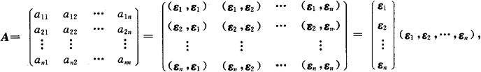 柯西不等式 |(α,β)|≤‖α‖‖β‖. 三角不等式 ‖α+β‖≤‖α‖+‖β‖. 度量矩阵 设ε1,ε2,…,εn是Vn的一组基,且有(εi,εj)=aij(i,j=1,2,…,n)(显然aij=(εi,εj)=(εj,εi)=aji,i,j=1,2,…,n),令