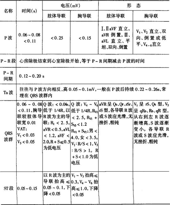 图7-2 心电图测量方法 ⑥心电图上时间与电压计算:一般心电图在描记时走纸速度为25mm/s,定标为10mm。心电图图纸上每一小方格的高、宽均为1mm,高度代表电压,1mm=0.1mV,宽度代表时间,1mm=0.04s。如果走纸速度和电压有调整,必须另加注明。 ⑦测量方法 a.电压测量:直立波(正波),从基线上缘垂直测量到波的顶端,即为直立波的电压。向下波(负波),从基线下缘垂直测量到波的最低点,即为向下波的电压。各波的总和为正负波的绝对值相加。 b.时间测量:各波的宽度即为各波的时间,从离开基线之点起到各波回到水平线上的间距,为该波的时间。 2.波、段、间期的正常范围:成人心电图各波、段、间期的正常范围见表7-5。正常P-R间期最高限度见表7-6。 表7-5 成人心电图上各波、段、间期的正常范围