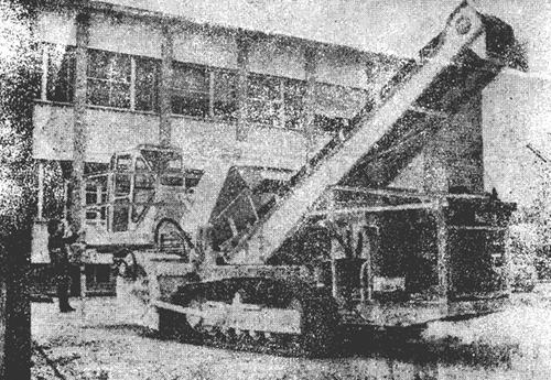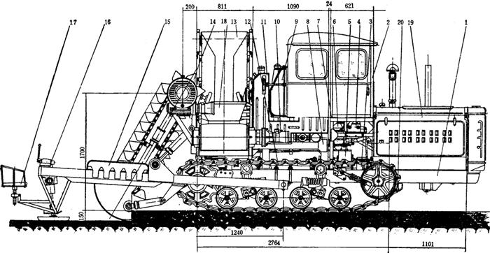 1-发动机吊架及主梁加长 2-闭式驾驶室及仪表盘 3-链齿式联轴器 4-行车操纵机构 5-副变速取力箱 6-主变速操纵机构 7-驾驶室座架 8-液压油箱架 9-柴油箱修改 10-液压管系总成 11-液压油箱 12-传动轴 13-皮带输送机 14-链斗提升机 15-收盐铲装置 16-多路换向阀安装 17-尾部操纵座 18-受料槽 19-发动机及外罩 20-拖拉机底盘