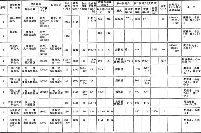 国外均为死碴盐收盐机,种类较多,主要型号及性能见表2-8-20,图2-8-28、图2-8-29分别为黑勇士盐场和意大利某盐场所使用的收盐机。