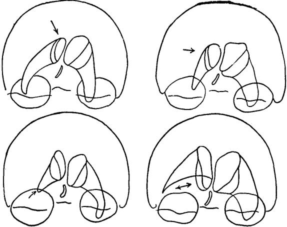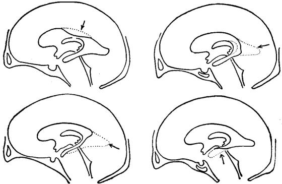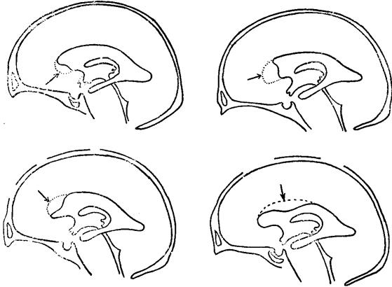 图140 异常气脑造影(3)(各不同部位占位性病致脑室改变) |