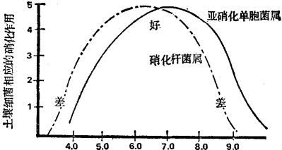 图17.7 与氨注射到土壤后扩散模式有关的pH轮廓线 (a)施用后的当时 (b)施用后8星期 铵带内的硝化作用由外向内推进。当这个过程减慢时该区域NH4-N的浓度就增加。使用者根据这个作用可以灵活调节液氨施用量,也使作物对氮需要的模式和硝态氮的有效性一致。 (4)施用深度 液氨施得比较深,效果往往比较好。这可能是由于克服了土壤环境使硝化速率减低之故。 (5)土壤pH pH对微生物活性总的影响(见图14.2),是专性硝化细菌最适pH的范围最狭窄,由图17.10所示。