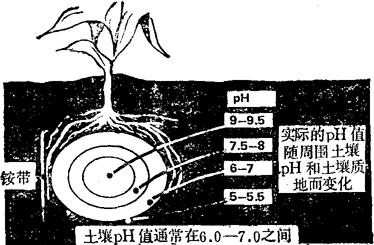 图17.11 硝化作用和土壤pH 这部分地说明了根系有围绕良好pH的肥料带而生长的倾向,并从养分富足区域吸取养料。 施用每公顷200公斤氮素的氨,当完全被硝化时,即可产生相当于每公顷700公斤左右硫酸的酸度。由于多数土壤具有缓冲能力,能较容易地吸收相当数量的酸,以致没有多大的影响。但氨和其它铵态氮肥连续施用,土壤会变酸,这在第七章已作了阐述。在新南威尔士州多数灌溉区不存在这个问题,因为在灌溉水中加了足量的盐基化合物(碳酸盐和碳酸氢盐),以中和一部分酸。土壤酸性,灌溉水中碳酸盐和次碳酸盐含量又低的地方,要施用石灰。而在碱性土壤中,酸化作用一般能使土壤养分有效性提高。 |