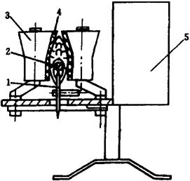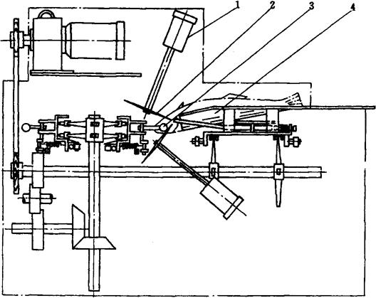 图1-12-25 双刀去鱼头机 1-切刀电机 2-刀具 3-夹紧装置 4-输送带 两把切刀分别由2台电动机1控制。切刀呈V形排列,并可根据鱼体大小进行调节。输送带上设有盛鱼槽,呈12°倾斜,盛鱼槽前部均有一副鱼头夹紧装置3,可避免切头时鱼体产生外移。工作时,将鱼置于盛鱼槽内,利用鱼体的自重使鱼头向下倾斜,鱼腹向上,同时鱼头被夹紧装置夹住。然后,输送带向前输送,当通过V形的切刀时,鱼头被切除。 3.5 剖腹、去内脏机 剖腹、去内脏机分为无头鱼剖腹、去内脏机和带头鱼剖腹、去内脏机。 3.5.1 无头鱼剖腹、去内脏机(图1-12-26) 无头鱼剖腹、去内脏机主要由夹鱼输送带、导向器、剖腹刀、去内脏轮及传动系统组成。