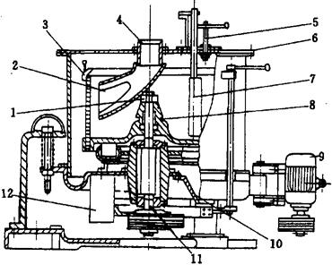 图1-12-27 带头鱼剖腹、去内脏机 1-卡子 2-进料口 3-输送带 4-刀具 5-旋转刷 6-喷水器 7-刀具调节机构 8-出料口 3.6 鱼体切段机 鱼体切段机供鱼处理中鱼体按所需规格切段用。机体由机架、斗式输送机、圆片切刀轴、喷水器及安全联轴器等部分组成。电动机经联轴器直联切刀轴,另一端则由蜗轮副再经斜齿轮减速带动斗式输送链。 作业时,需切段的鱼体由人工按条状放入斗式输送链内,经过安装在机身头部的圆片切轴后,即完成切段任务,输入盛料斗内。在圆刀切段时,用水喷淋起润滑与冷却作用。 3.7 贝类碎壳取肉法加工机械 贝类碎壳取肉法加工机械由破碎机、取肉机等组成。破碎机一般采用爪式,由机体、动齿盘、定齿盘等组成。依靠高速旋转的动齿盘的圆齿和扁齿的冲击,并在离心力的作用下,贻贝由动齿盘中心向外移动,不断地与定齿盘发生撞击,将贻贝破碎成12mm×12mm大小方块后从下部排出。 如图1-12-28所示,取肉机的主要工作部件为1个筒形的转鼓。工作时,将从破碎机出来的碎贻贝从入料口4喂入,通过喷嘴2喷洒在转鼓3内壁上。转鼓壁上有钻孔,底部的支撑盘8为孔板式结构。由于转鼓随主轴11在电动机9的带动下高速旋转,受离心力的作用,贝肉从转鼓壁孔甩出,经排肉浆口12排出。而壳渣无法通过钻孔,被截留在转鼓内壁上,待积到一定厚度后,将转鼓转速降至60r/min左右,由刮板7将壳渣刮落,经排壳渣口10排出。