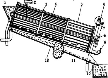 图1-12-28 生贻贝取肉机 1-压盖 2-喷嘴 3-转鼓 4-入料口 5-定位杆 6-上盖板 7-刮板 8-支撑盘 9-电动机 10-排壳渣口 11-主轴 12-排肉浆口 3.8 贝类开壳取肉法加工机械 开壳取肉法有蒸煮、微波、红外线、激光开壳等多种方式,其中常用的是蒸煮式。蒸煮式开壳机械主要由滚洗分粒机、蒸煮机、脱肉机等组成。 (1)图1-12-29所示为滚洗分粒机的结构。其主要作用是清洗、除杂,获得适于加工的生贝。主要工作部件是一个两端开口的转笼,倾斜放置,周围均布许多栅条,栅条间距上小下大。
