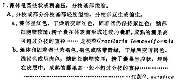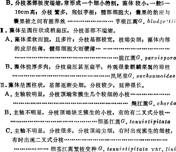 | 释义 | 江蓠人工养殖 (一)江蓠的生物学 1。江蓠的分类地位及我国的主要养殖种类江蓠在自然分类系统上属:红藻门(Rhodophyta)、真红藻纲(Florideophyceae)、杉藻目(Gigartinales)、江蓠科(Gracilariaceae)、江蓠属(Gracilaria)。 我国江蓠主要养殖种类的检索表
