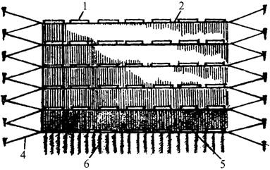 图6-29 江蓠筏式养殖结构 1.浮竹 2.浮绠 3.木桩 4.脚绳 5.苗绳(平挂) 6.苗绳(垂挂) 养殖水深一般2~3米,浮筏每台装设浮绠6~8条,浮绠每条长约30厘米,系长2米的竹筒浮子7个,浮绠两端有缆绳分别用木桩固定,浮绠间距3米,顺流设筏。夹苗绳用野生芒草制成,直径约1~1.5厘米,平养的夹苗绳长3.6米,垂养的夹苗绳长1.8米,绳距25厘米,苗绳上每距16厘米夹苗一簇,每簇1~3株。 3.养成管理 (1)水层调节 水层浅、光线过强,可导致江蓠幼苗变白死亡;水层深、光线弱,江蓠生长缓慢。水层一般控制在20~40厘米。 (2)施肥 贫瘠海区一般用0.1%的硝酸铵溶液每周浸泡2次,每次1小时。 (3)安全护理 季节风对筏式养殖的危害很大,往往对生产造成很大破坏,因此要经常对筏架进行安全护理。 |