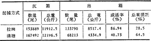起捕方式影响到鱼种的伤亡程度。根据北京市密云水库用清塘和拉网两种方式起捕鲤鱼种差别很大(表2-99)。
