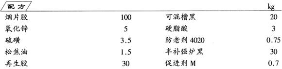 先将烟片胶、再生胶与促进剂M塑炼,再加入其余全部组分进行混炼,薄通,即得胶料。再按外胎侧胶加工工艺成型,经硫化,制成轮胎。