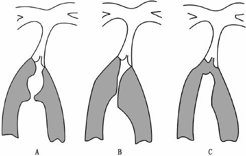 图7-1 右室流出道狭窄类型 A.漏斗部局限狭窄,形成第三心室;B.漏斗部管型狭窄;C.假性共干 (2)肺动脉瓣:75%患者有不同程度瓣膜狭窄,约2/3为两瓣畸形。瓣叶可增厚,交界粘连,导致瓣叶活动度降低及瓣口狭窄。严重时瓣叶融合成幕顶状,瓣口仅针孔样大小。成人瓣膜增厚或部分钙化。约10%的患儿瓣膜发育不良,常合并肺动脉瓣环狭窄。 (3)肺动脉瓣环:法洛四联症患者之肺动脉瓣环均小于主动脉瓣环,但不一定构成梗阻。漏斗口位置偏低,漏斗腔较大者很少狭窄。反之,漏斗口位置高、漏斗腔较小者,瓣环处心内膜纤维组织增生,形成不同程度的环状狭窄,并多有瓣环狭窄。漏斗部呈管状狭窄者,瓣环均有严重狭窄。 (4)肺动脉及分支:漏斗部发育不全,流出道呈弥漫性管状狭窄者,多伴有主肺动脉狭窄,主肺动脉直径多不足主动脉直径的一半,且向左后方移位,隐于主动脉后方并伴有瓣环狭窄。肺动脉分叉处狭窄较少见,若有则分叉部呈“Y”形。左、右肺动脉狭窄多见于法洛四联症合并肺动脉闭锁者。极少数病例左或右肺动脉缺如,实际上系左或右肺动脉与主肺动脉失去连接,远侧肺动脉由未闭动脉导管或主—肺动脉侧支循环供应。左肺动脉缺如约占3%。肺动脉侧支循环主要有支气管动脉和锁骨下动脉、无名动脉与肺动脉形成的纵隔旁侧支循环两条途径。肺动脉瓣缺如的病例(3%~5%),其肺动脉瓣环显着狭窄,右心室严重肥厚,称合并肺动脉瓣缺如综合征的法洛四联症。 (5)肺动脉狭窄的分型:①单纯漏斗部狭窄,占26%;②漏斗部及瓣膜狭窄:瓣环无狭窄,漏斗部狭窄位置多较高,漏斗腔较小或无漏斗腔,占26%;③漏斗部、瓣膜、瓣环狭窄:漏斗部狭窄位置均很高,多无漏斗腔,主肺动脉多有牵拉性狭窄,占16%;④弥漫性管状狭窄:几乎均伴有瓣膜狭窄或二叶瓣,其中约有1/3伴肺动脉分支狭窄,占27%;⑤单纯肺动脉瓣膜及瓣环狭窄,占5%。 2.室间隔缺损 法洛四联症的室间隔缺损分为嵴下型和肺动脉下型两种。极少数病例为多发性室间隔缺损。 (1)嵴下型室间隔缺损:位于主动脉瓣下,其上缘为圆锥隔以及邻近主动脉右冠状瓣环旁一段光滑的右心室前壁,后缘为三尖瓣隔瓣环和窦部室间隔。又可分为两类:①隔束后下肢发育良好,缺损与三尖瓣环间有一连续肌束,覆盖膜部室间隔。此类所占比例较小;②缺损后下缘为膜部室间隔,三尖瓣、二尖瓣附着处和主动脉瓣环连接所形成的纤维环。此类所占比例较大。