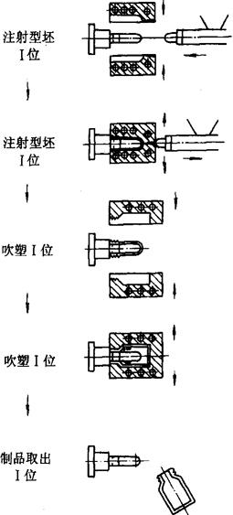 | 释义 | 注射吹塑成型机 1 应用范围 注射吹塑成型机可用来吹塑成型几毫升至1000毫升(最大可达4L)的塑料中空制品。塑料原料有PVC、PE、PS、SAN和PC等。此法生产的制品尺寸精确,质量有保证,强度高,特别是封口尺寸精度极高,可用来包装化妆品,医药品和食品。这种包装品,因为密封性好,货架期比同类挤吹制品长,因而目前在国内已逐步被推广应用。 2 基本原理和主要结构 2.1 基本原理(图2-11-11)
