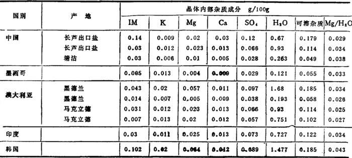 海盐的质量和国家标准等级,是由海盐中所含杂质的种类和多少决定的,受晶体生长条件、工艺设备和操作等的影响。现将盐的杂质有关内容列于表2-5-12~表2-5-16。