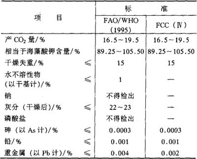 鉴别方法 (1)本品3%悬浮液的pH中性。 (2)本品的0.5%NaOH溶液中加入其1/5体积的2.5%氯化钙溶液,应形成体积较大的凝胶状沉淀,而有别于阿拉伯胶、羧甲基纤维素、羧甲基淀粉、卡拉胶、明胶、印度树胶、刺梧桐胶、槐豆胶、甲基纤维素、果胶和黄芪胶。 (3)本品的0.5%NaOH溶液中,加入其1/2体积的硫酸铵饱和溶液,不得产生沉淀,而有别于琼胶、羧甲基纤维素、卡拉胶、脱脂果胶、槐豆胶、甲基纤维素和淀粉。 (4)本品的0.5%NaOH溶液用硅藻土净化,测定其旋光度,20℃时的旋光度应大于-0.80°。 (5)用0.1mol/L氢氧化钠溶液0.15mL,尽可能溶解本品0.01g,加酸式硫酸铁试液*1mL,5min内应呈樱桃红色,并最终变为深紫色。 *酸式硫酸铁试液:取硫酸7.5mL,加入100mL水中,加硫酸亚铁80g,加热使之溶解。另取7.5mL与20mL水混合,加温后加入上述硫酸亚铁溶液中,将该混合液浓缩至微红色蒸汽突然消失,液体由黑色变为红色为止。检验亚铁应不存在。必要时可加硝酸数滴,并重新煮沸,冷却后,加至110mL。 毒理学依据 1.GRAS FDA-21CFR 184,1610。 2.ADI 无需规定(FAO/WHO,1994)。 使用 增稠剂、稳定剂、乳化剂。 1.使用注意事项 在酸味较大的水果汁和酸性食品中应用效果差,不宜使用。 2.使用范围及使用量 (1)我国《食品添加剂使用卫生标准》(GB 2760-1996)规定:可按生产需要适量用于各类食品。 (2)FAD/WHO(1984)规定:用量及限量为,用于酸黄瓜,500mg/kg(单用或其它助溶剂合用);胡萝卜罐头,10g/kg(单用或与其它增稠剂合用);即食汤、羹,3000mg/kg(单用或与海藻酸钠合用);鲭鱼及鲹鱼、沙丁鱼及其制品等罐头,20g/kg(仅以罐头汤汁计,单用或与其它增稠剂或胶凝剂合用);青刀豆和黄荚刀豆、甜玉米、蘑菇、芦笋、青豌豆等罐头,10g/kg(单用或与其它增稠剂合用,产品中含奶油或其它油脂);酪农干酪(与稀奶油混合物),5g/kg(单用或与其它稳定剂和载体合用);乳脂干酪,5g/kg(单用或与其它增稠剂合用);火腿、猪脊肉按GMP;稀奶油,5g/kg(单用或与其它增稠剂或改性剂合用,仅用于巴氏杀菌掼奶油或用于超高温杀菌掼打稀奶油及消毒稀奶油);发酵后经加热处理的增香酸奶及其制品,5000mg/kg(单用或与其它稳定剂合用);冷饮,10g/kg(按最终产品计,单用或与其它乳化剂、稳定剂及增稠剂合用)。 (3)美国FDA(1989)规定:用途及用量为,用于糖果和糕点糖霜,1%;布丁,0.7%;加工的水果和水果汁,0.25%;其它食品按工艺要求使用不超过0.01%。 (4)实际使用参考:参见海藻酸钠品种附表。 |