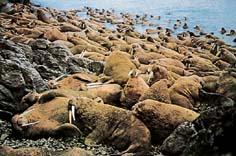 | 释义 | 海象(Odobenus rosmarus) 亦称“海马”。 哺乳纲,鳍足目,海象科。雄的体长可达3米。头圆,无耳壳,嘴短而阔;上犬齿特别发达,形成獠牙,宛如象牙,用以掘食和攻防。 四肢呈鳍状;后肢能弯向前方,借以在冰块或陆上行动。 通常群居于大的浮冰或海岸附近,以牙掘食泥沙中贝类。4~6月生殖,通常仅产一仔。 分布于北极圈内。肉和脂肪可食,牙可作雕刻材料,骨和皮可做器具。