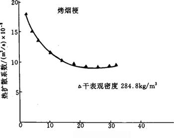 图4-6-25 烤烟烟梗比热容随含水率变化的曲线 注:烤烟烟梗为:河南、湖南、安徽、东北、山东、云南、贵州7种中部三级烟梗的等比例混合物 (二)烟叶的热扩散率 热扩散率与物料的热导率、比热容和密度之间具有如下的函数关系: