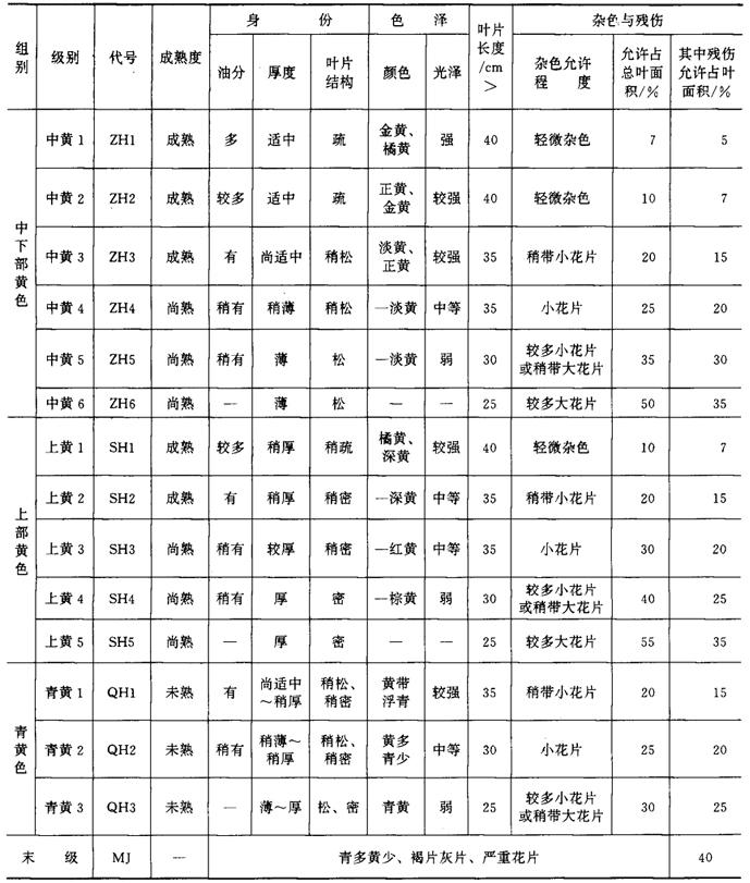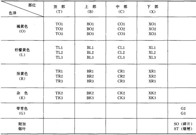 3.加拿大烤烟分级 先按部位分为上部、中部、下部三个组,再按颜色分柠檬黄和淡橙黄、橙黄和淡棕黄、深棕黄、杂灰、带青柠檬黄和淡橙黄、带青橙黄和棕红黄、樱桃红七组,每组按品质因素分成1~6个等级,共计79个等级。 (三)我国烤烟分级标准简介 根据国外分级经验,结合国内实际,对烟叶进行部位和颜色分组后,再按品质因素(烟叶成熟度、叶片结构、身份、长度等)档次进行等级划分。烟叶残伤程度作为分级的限制因素进行控制。 1.原有烤烟15级制分级标准(GB2635-86) 见表4-1-21。 表4-1-21 我国原有烤烟分级(15级制)标准