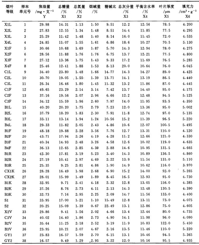 注:1.H1F和H2F两个等级烟叶在生产中较少出现,选取的5套仿制样品中也较少,未做测定分析。 2.烟叶吸湿性以平衡含水率表示,为温度25℃,相对湿度65%的环境条件下平衡5d的含水率。 |