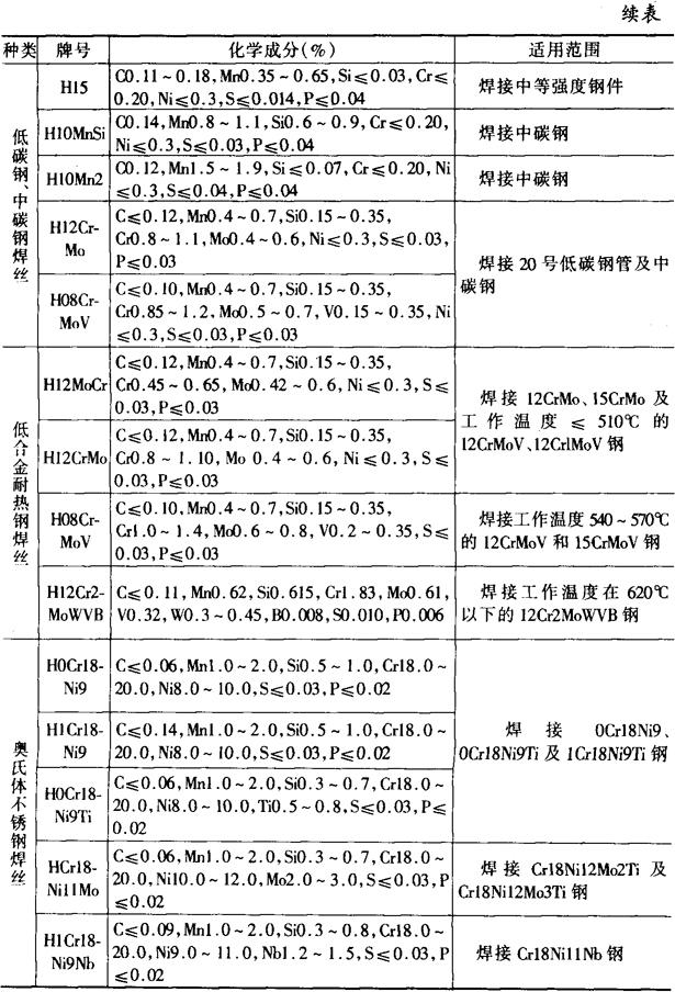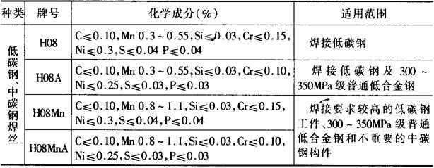 焊丝的化学成分和液态流动性直接影响焊缝金属的机械性能和焊缝成形,一般应根据母材的化学成分来选择焊丝。常用焊丝牌号、化学成分及用途见表12-11。