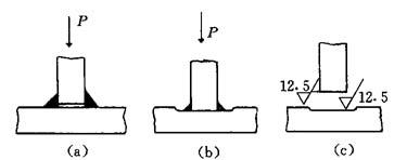 图11-119 受压的丁字接头 (a)焊脚尺寸大;(b)按(c)加工后,焊脚尺寸可减校(c)接触面机加工